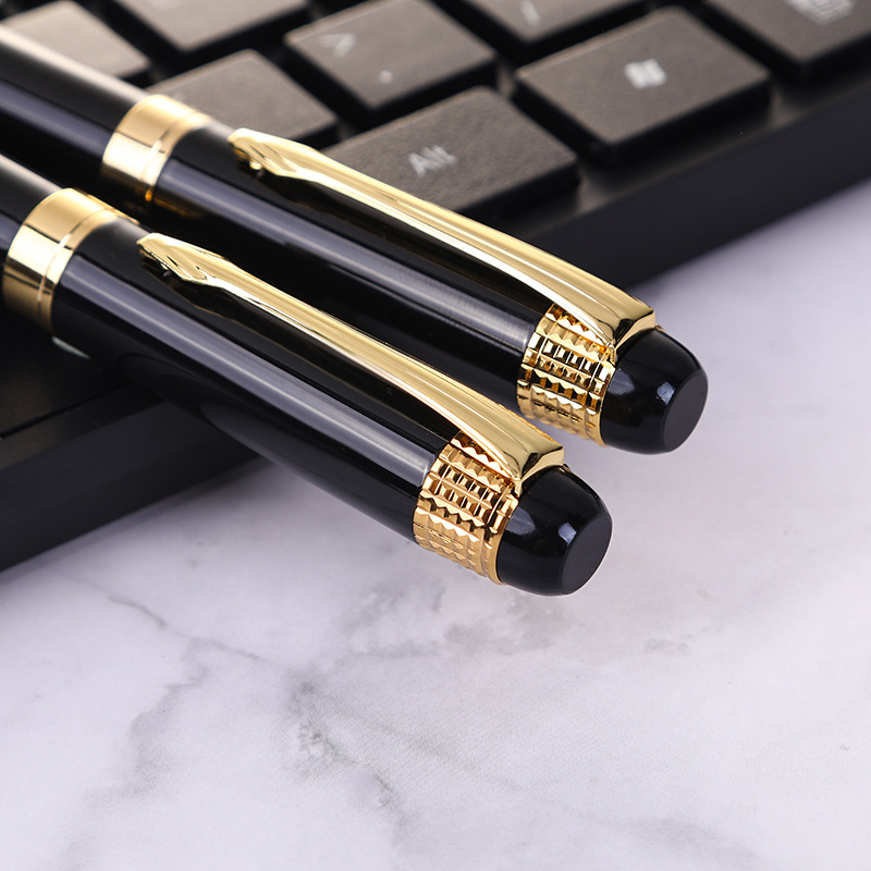 深みのある光沢のある軸に、精緻な格子模様の金装飾が施された高級感溢れる万年筆です。 クリップ部分とキャップリング、胴軸リングには上品な金色の金属パーツを使用し、ビジネスシーンでも存在感を放ちます。 太字のペン先が力強く滑らかな筆記を実現し、署名や宛名書きなど格式ある場面に最適です。 重厚感のあるデザインは手に馴染みやすく、長時間の筆記でも快適な書き心地を提供します。